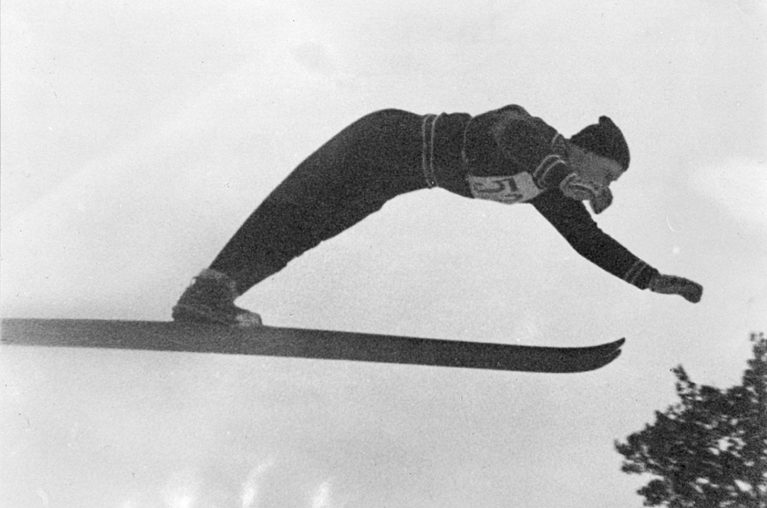 Torbjørn Falkanger satte bakkerekord med 60 meter i Granåsen i 1949. Foto: Sverresborg Trøndelag Folkemuseum