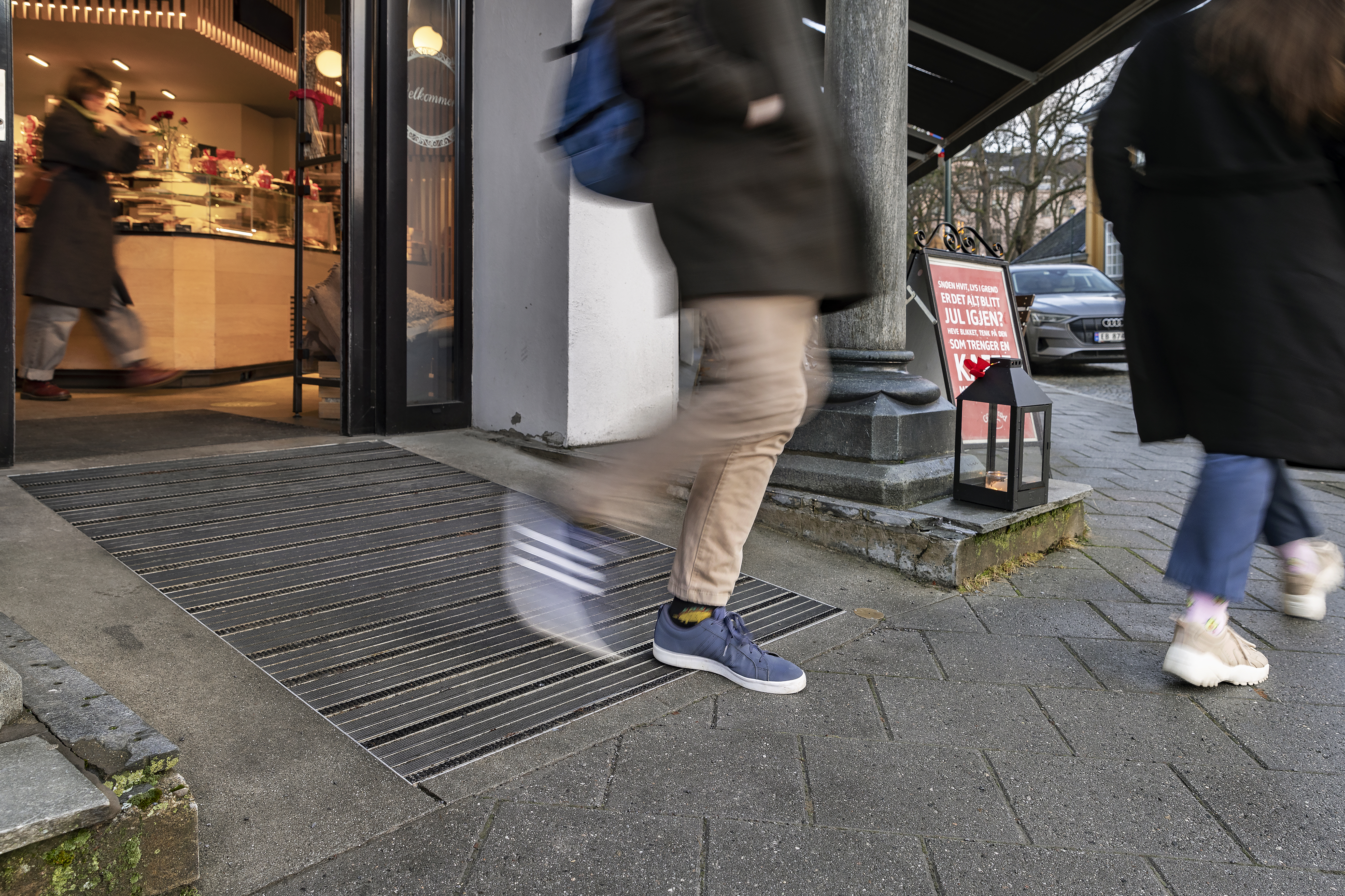 Matten er felt ned i betongdekket slik at overgangen mellom matte og betong er uten kanter. Det er ikke terskel under døren, her er det enkelt å trille inn.