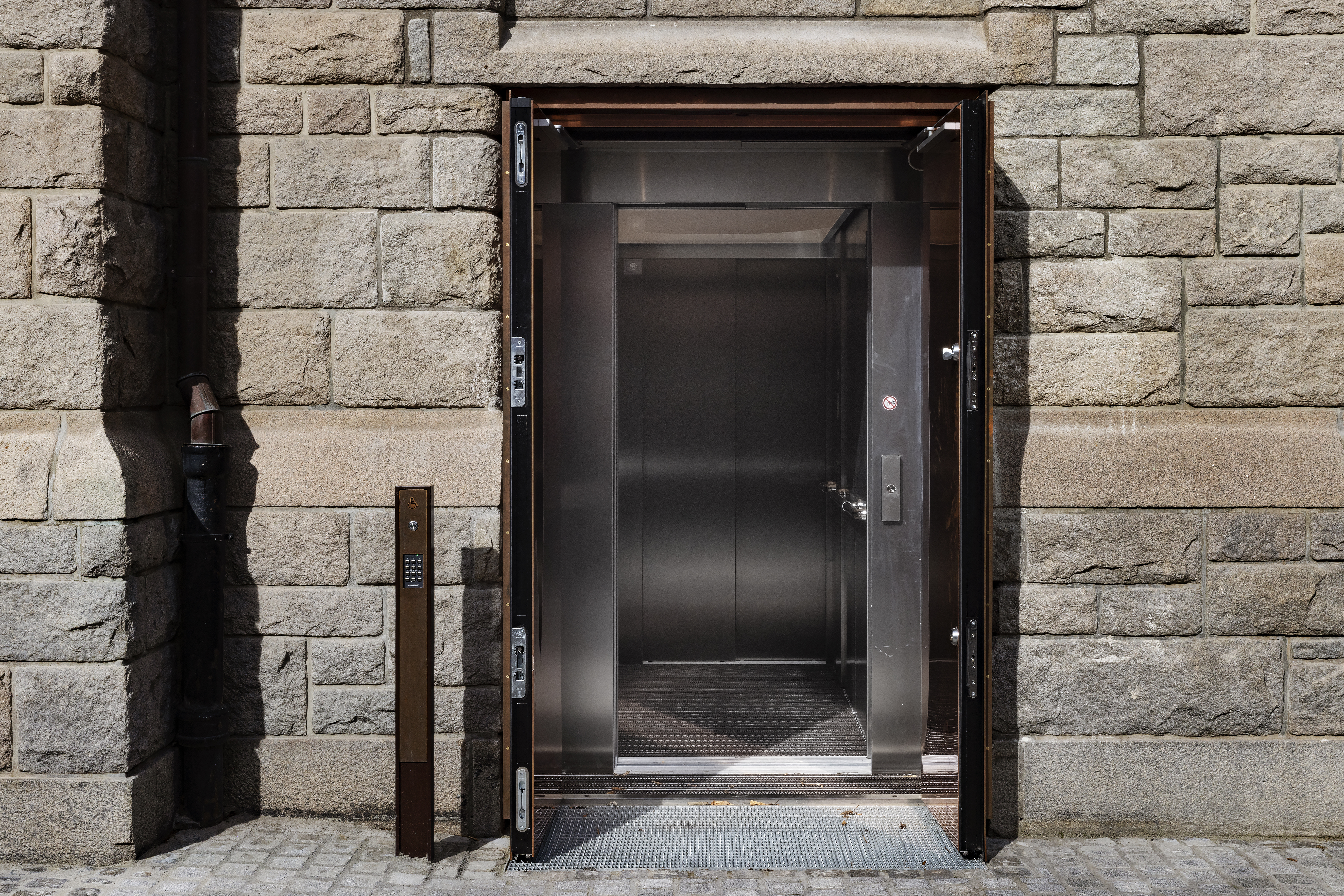 Det er lagt vekt på at heisen skal oppleves som en likeverdig inngang. Heisen fører direkte til det samme inngangspartiet som trappa og leder trinnfritt inn til resepsjonen og den gamle posthallen. Løsningen har høy arkitektonisk og materialmessig kvalitet, med heisdører i kobber. Rett ved heisinngangen står en fint formet stolpe i kobber, med knapp til heisen.