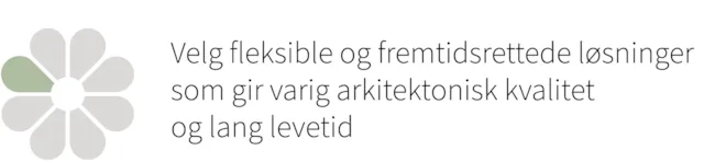 Utvikle robuste og fleksible bygg og byrom som kan utvikles og transformeres etter hvert som behov og bruk endrer seg. Unngå minimumsløsninger når det gjelder etasjehøyde og aksebredde.