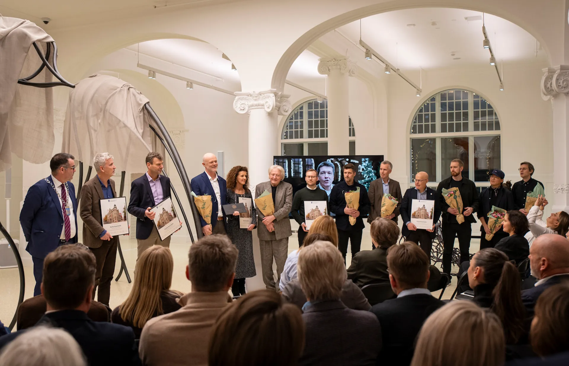 Svein Erik Nordbotten fra E C Dahls Eiendom (nr fire fra venstre) tok i mot Byggeskikkprisen for 2025 og framhevet det gode lagarbeidet mellom de involverte aktørene i prosjektet: Skanska, Skibnes arkitekter, Anemone Studio, Erik Langdalen Arkitektkontor og India Mahdavi Architecture and Design.