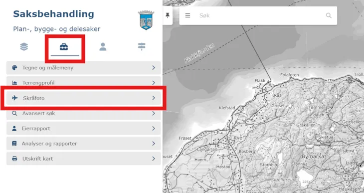 - For å se skråfoto velger du verktøyboksen i venstremenyen og klikker deg videre til skråfoto.