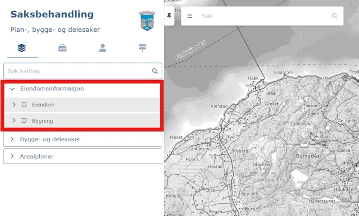- I menyen til venstre kan du søke på eller finne fram kartlag du vil vise i kartet.
