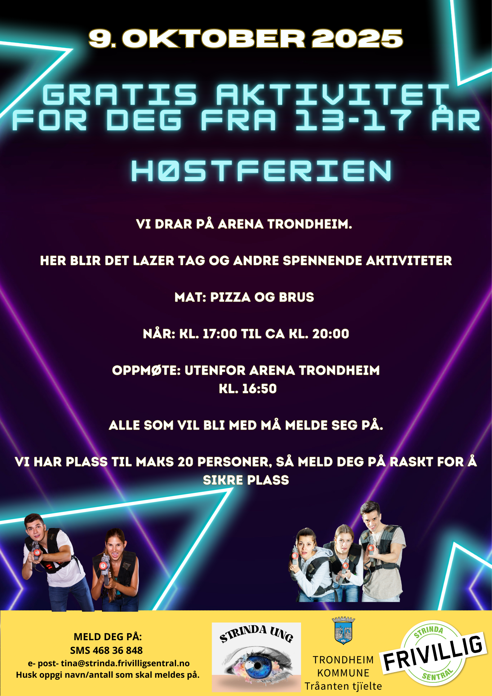For deg mellom 13 og 17 år. Her blir det Lazer tag og andre spennende aktiviteter, pizza og brus. Gratis. Ferietiltaket gjennomføres med støtte av Bufdir