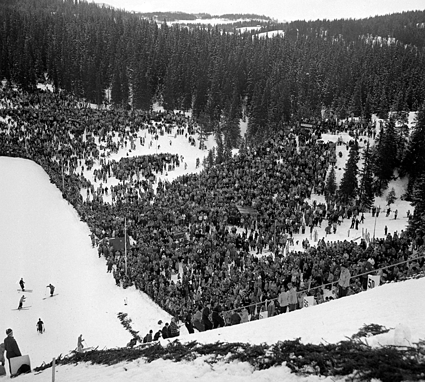 Trønderne gikk mann og kvinne av huse for å se Norges beste hoppere i NM i 1953. Foto: Sverresborg Trøndelag Folkemuseum