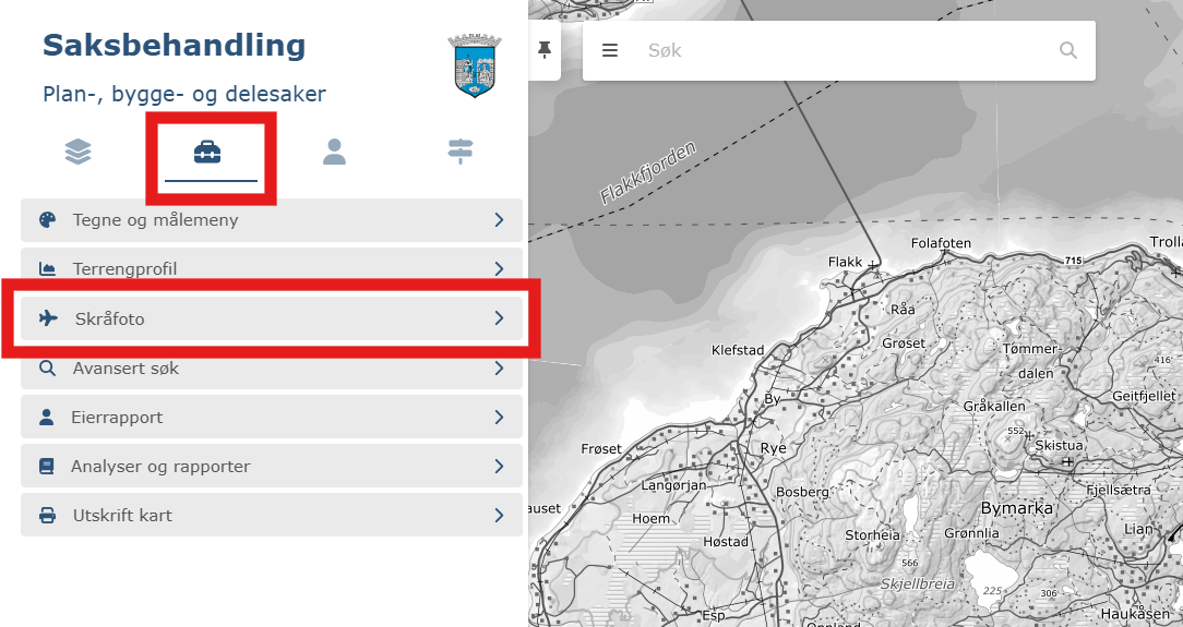 - For å se skråfoto velger du verktøyboksen i venstremenyen og klikker deg videre til skråfoto.