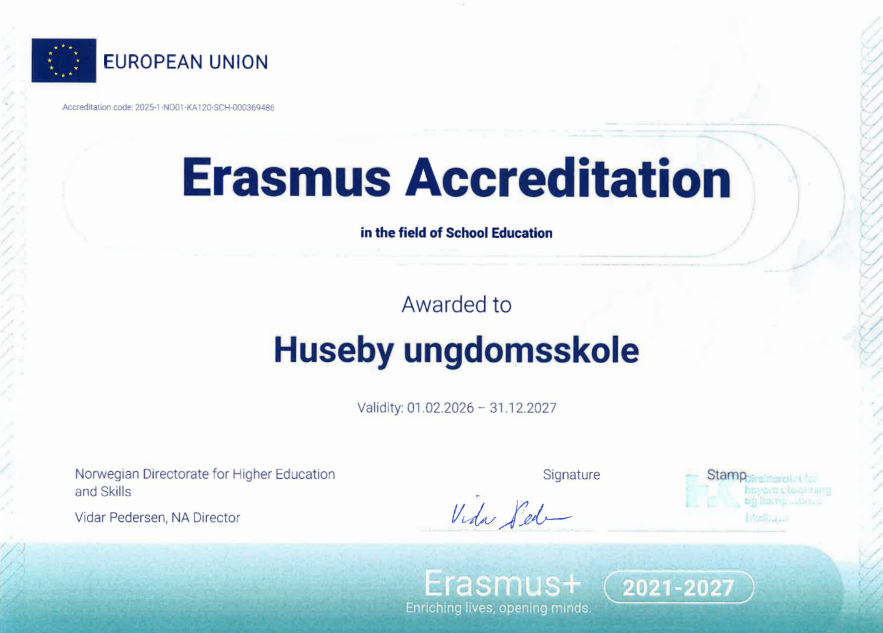 Huseby ungdomsskole har blitt akkreditert i Erasmus+ , og har dermed sikret seg midler for å reise til skoler i Europa og samarbeide internasjonalt. Målet med prosjektet er å styrke skolens utviklingsarbeid og gi elever og ansatte nye læringsmuligheter i et europeisk samarbeid.