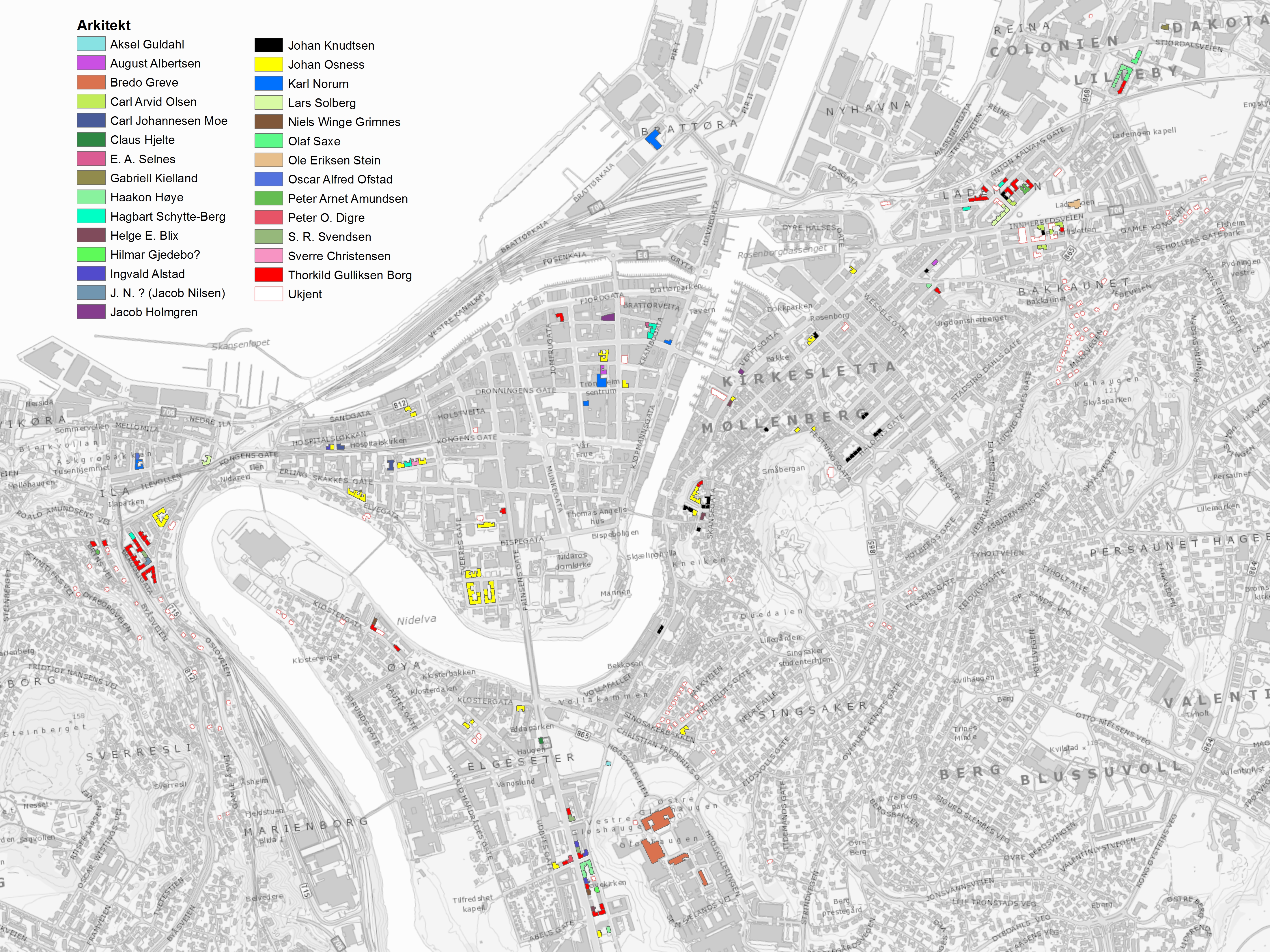 Her er oversiktskart over de 305 husene i jugendstil som ble registrert i 2012, vist med fargekode for arkitekt. For oppdatert kart, se Kulturminnekartet