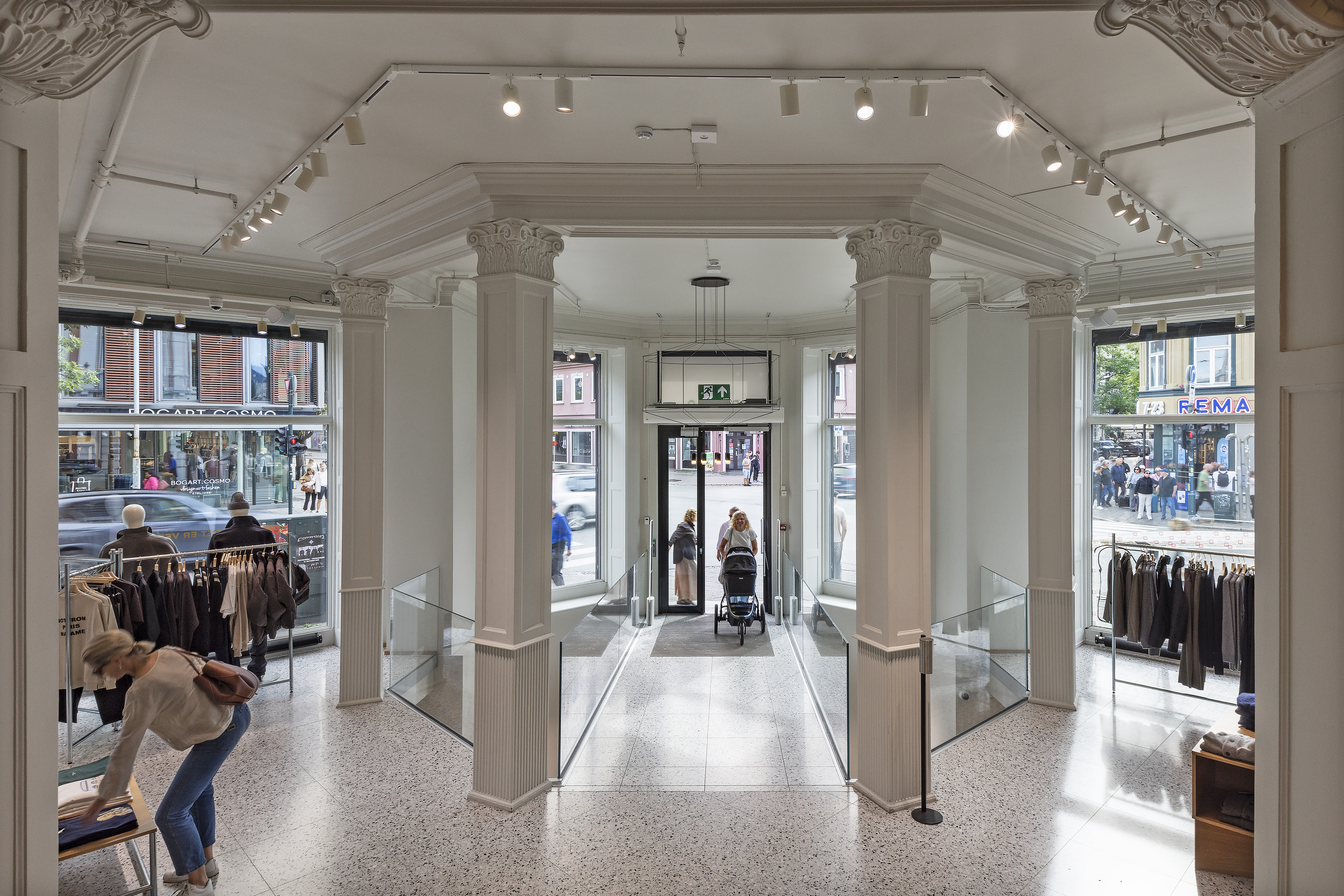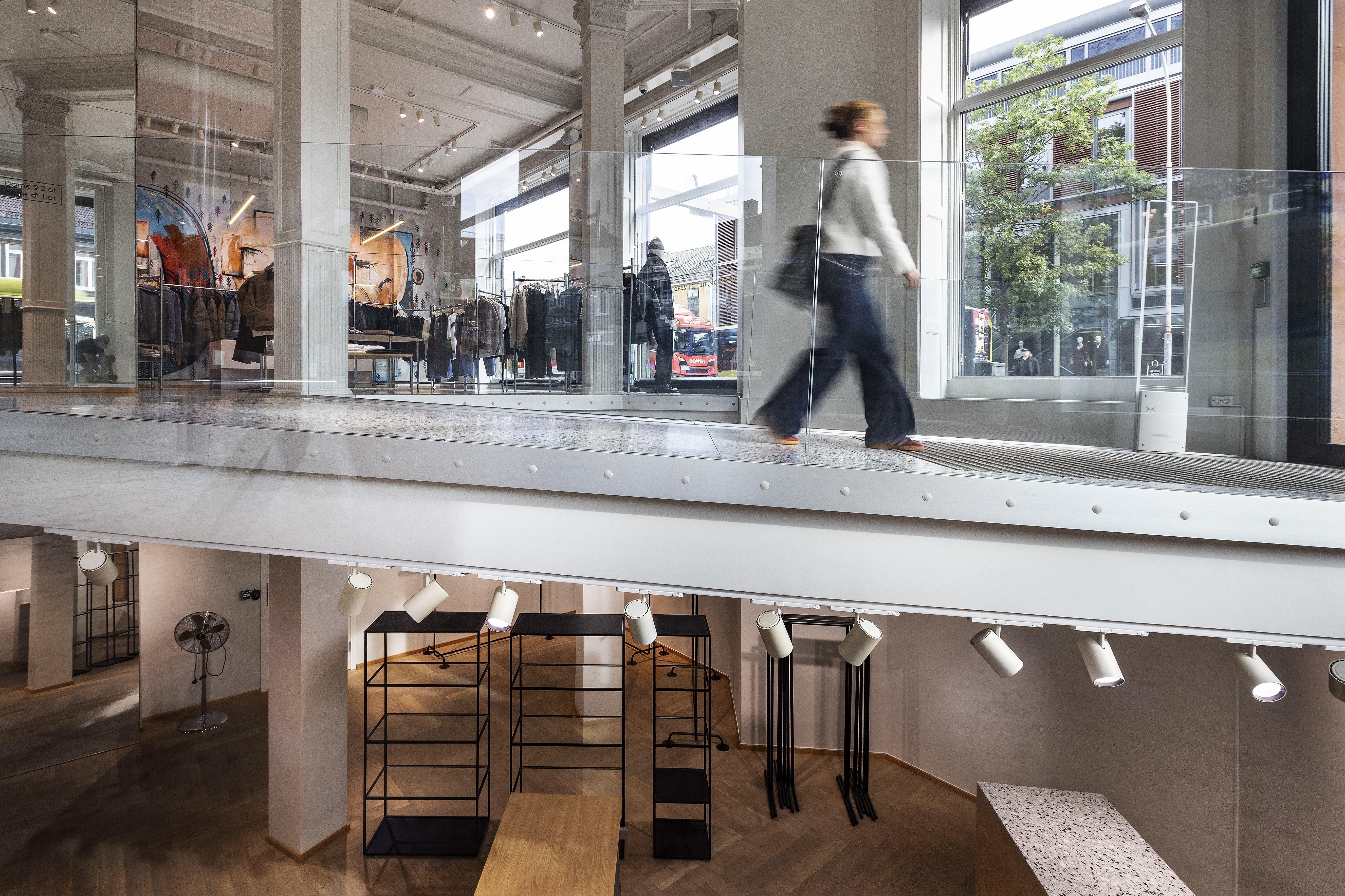 Innenfor dørene kommer man inn på en slak rampe, som ligger som en bru over en stor åpning i gulvet mot kjelleretasjen. Brua leder rett inn i butikklokalet.