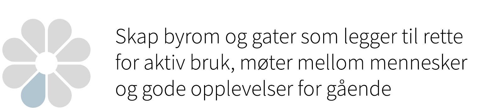 Attraktive gangmiljø skaper en attraktiv by. Flere forbindelser gir kortere avstander og mer valgfrihet. Utform appellerende gater, stier og sykkelanlegg. Prioriter myke trafikanter. Reduser eksisterende barrierer og unngå å lage nye. Vis respekt for barns bevegelsesfrihet.