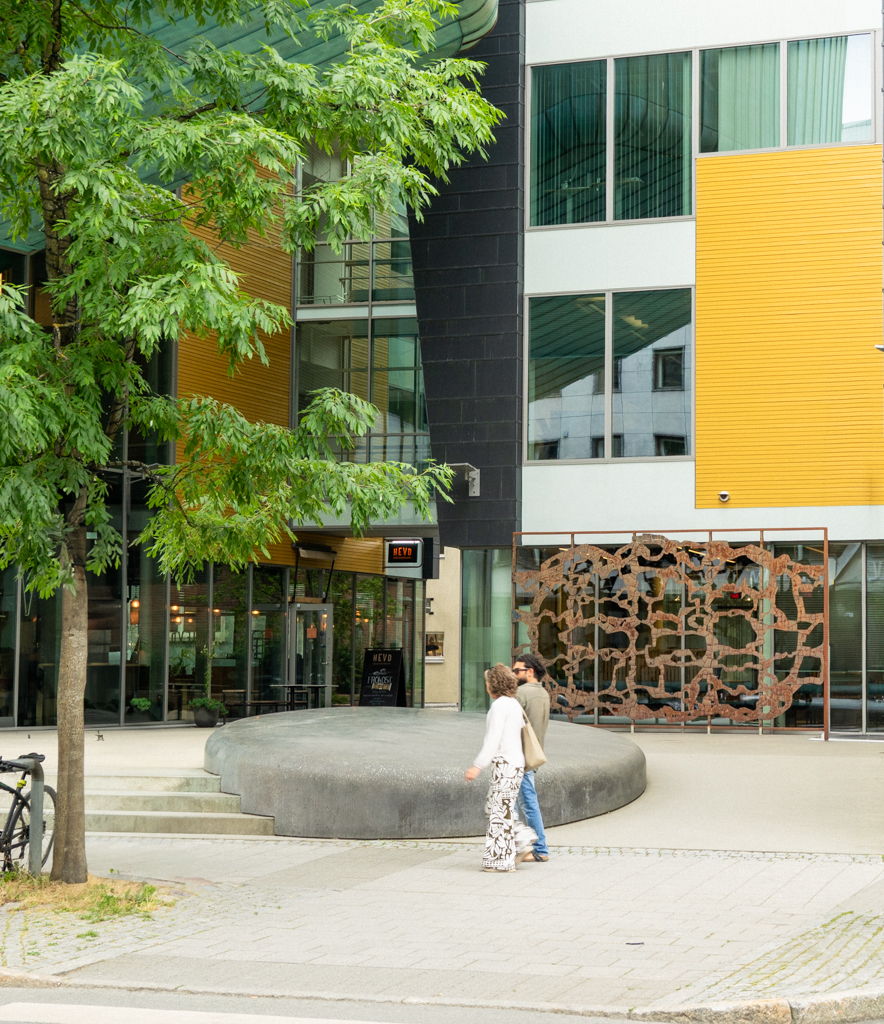 Det er åpnet en gjennomgang på tvers av kvartalet og utviklet et helt nytt byrom: Bankplassen. Konferansesalen svever over plassen med kobberkledde ytterflater, og binder svevende de to bygningsdelene sammen, i tillegg til å fungere som tak over plassen.