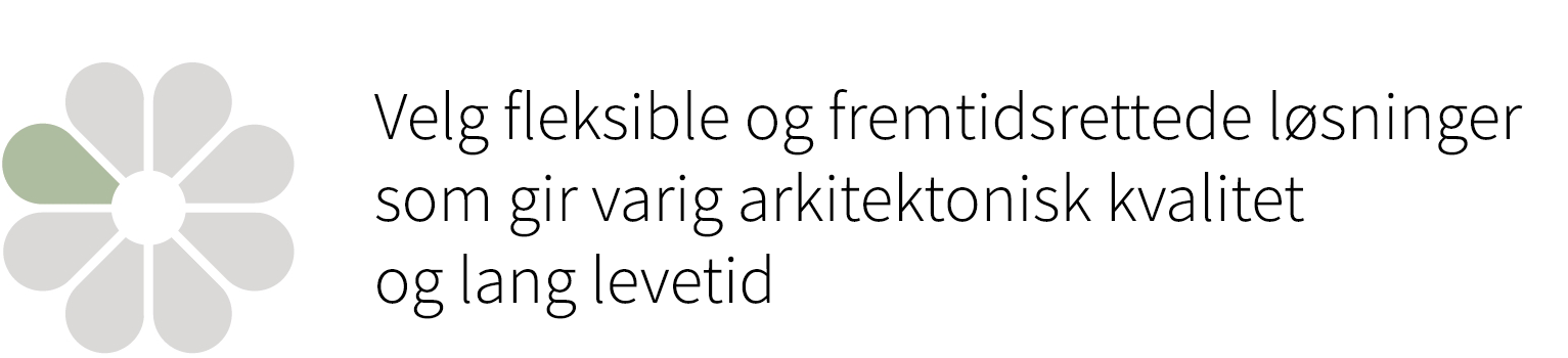 Utvikle robuste og fleksible bygg og byrom som kan utvikles og transformeres etter hvert som behov og bruk endrer seg. Unngå minimumsløsninger når det gjelder etasjehøyde og aksebredde.