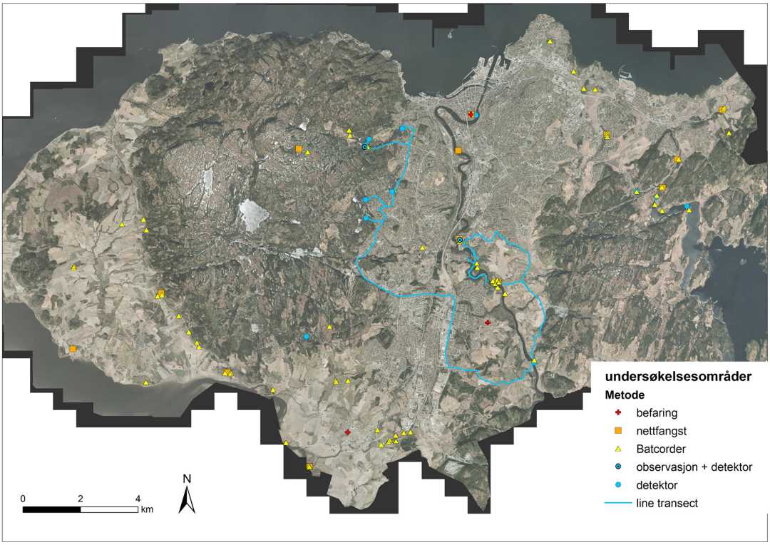 - Kart som viser områder som ble undersøkt for flaggermus sommeren i 2012